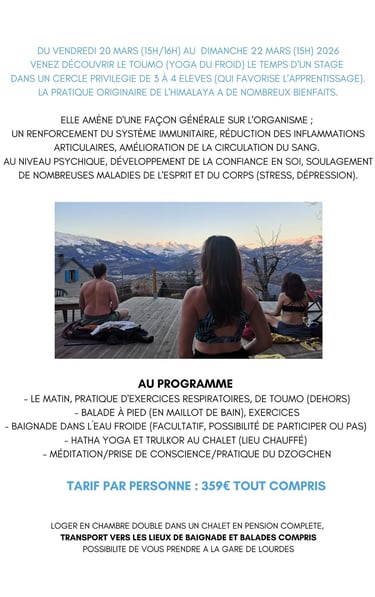 "Ce stage de à la montagne, dans ce petit havre de paix, permet à chacun de se purifier et connaître encore mieux son corps. Les différentes pratiques matinales ou en fin de journée nous apportent concentration et détachement à notre environnement habituel. Randonnées, baignade, contemplation: merci Mathieu, tu nous as fait vivre tout au long de ce séjour des expériences riches et intenses dans cette magnifique montagne tout en alliant la joie, l’humilité et la bienveillance. J’en suis ressortie pleine d’énergie positive, et je me sentais beaucoup mieux physiquement grâce aussi au régime alimentaire proposé. Une expérience à vivre!"