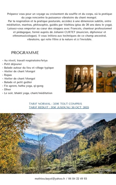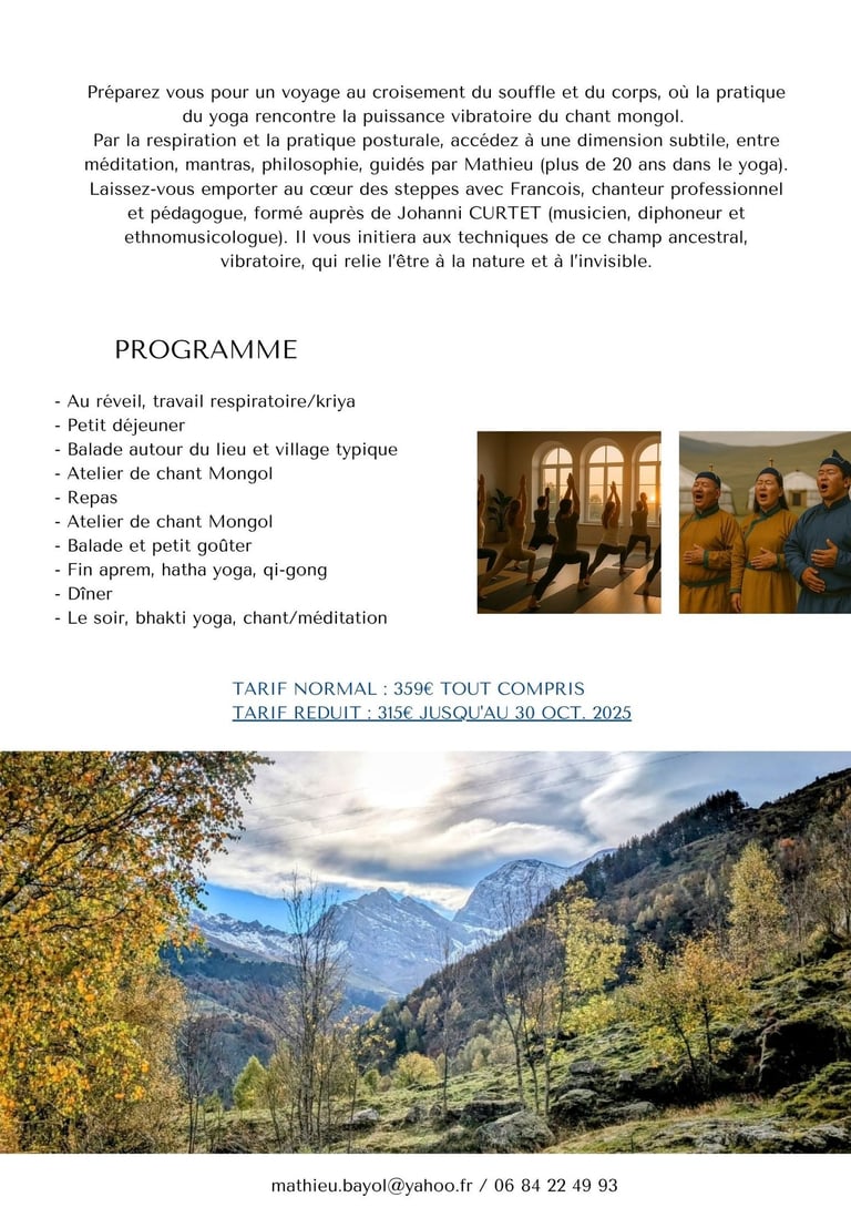 "Le top pour aller plus loin, je suis revenue de ce stage regonflée à bloc. Nouvelles pratiques de yoga et de pranayama, belles randonnées bien physiques, ambiance au sein du groupe …j’ai finalement appris à aimer la montagne ce qui au départ n’était pas gagné !!! Merci Mathieu pour la présence bienveillante et les conseils toujours personnalisés et pertinents. " Florence Lartigau
