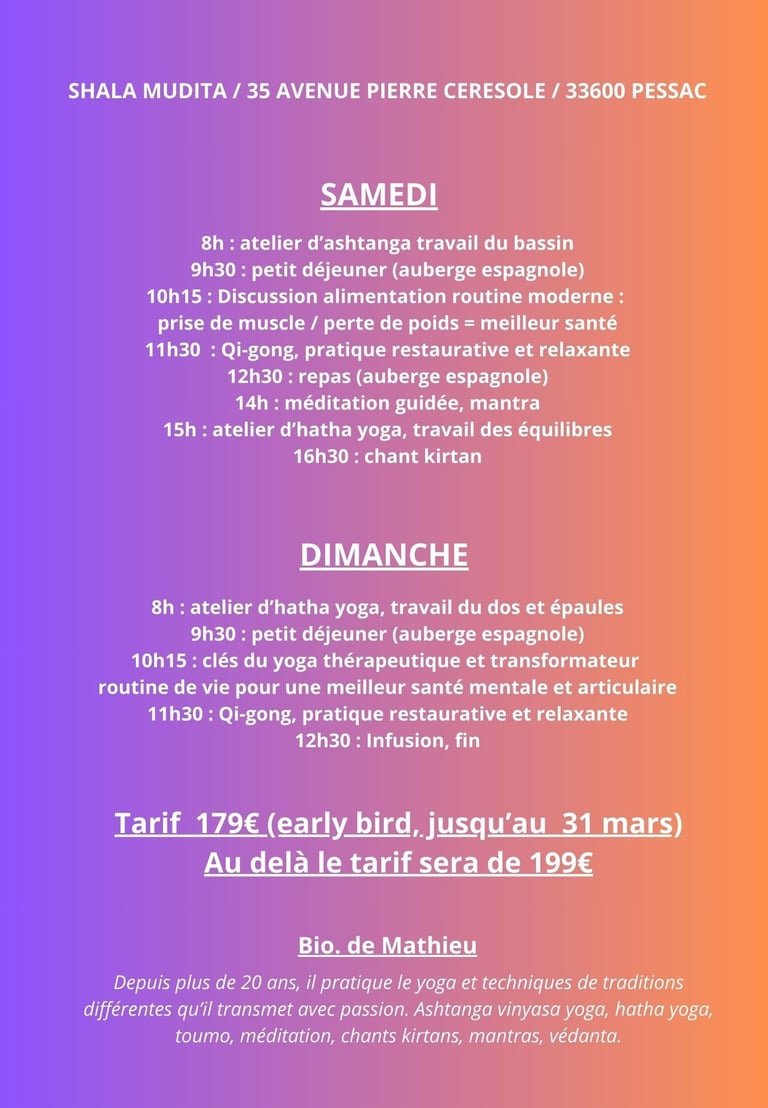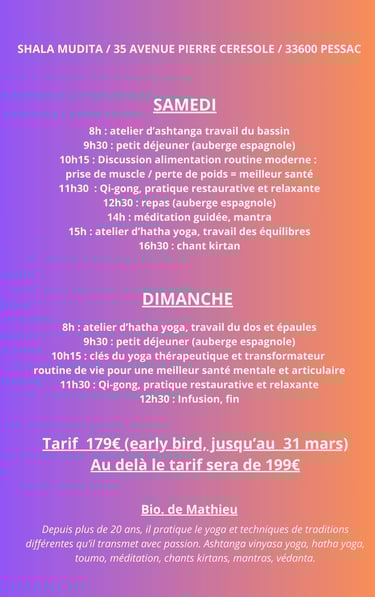 "Stage exceptionnel dans un cadre superbe. Ces quelques jours m'ont permis de me ressourcer et d'avancer sur le chemin de la paix intérieure, grâce notamment à la bienveillance et à l'enseignement de Mathieu."
